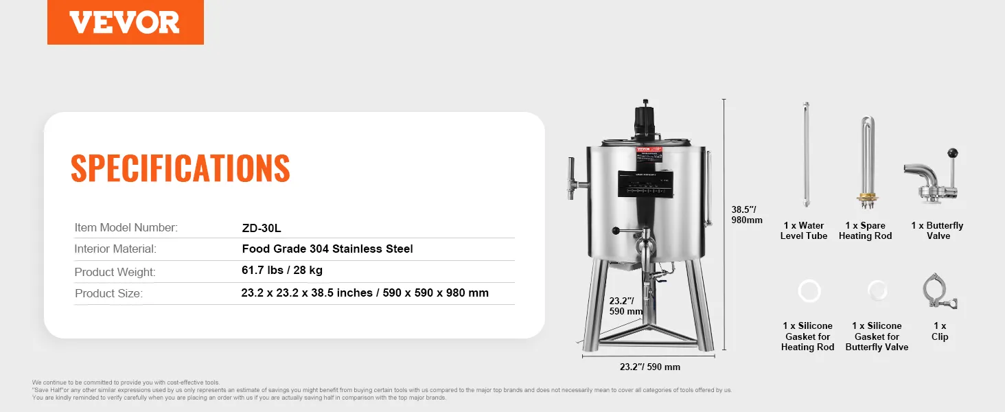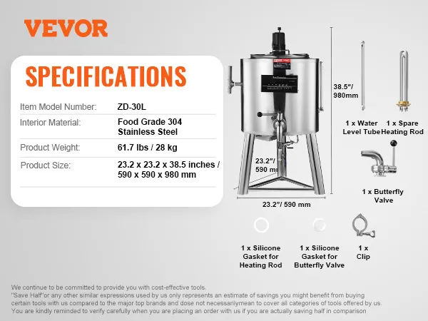 VEVOR Milk Pasteurizer 30L, Commercial Milk Pasteurization Machine, Food Grade 304 Stainless Steel, Professional Pasteurization with Time and Temperature Control, for Milk Juice Yogurt Sterilization