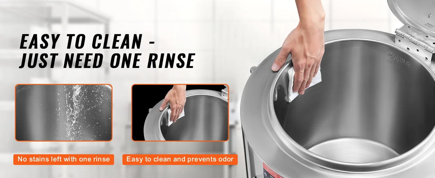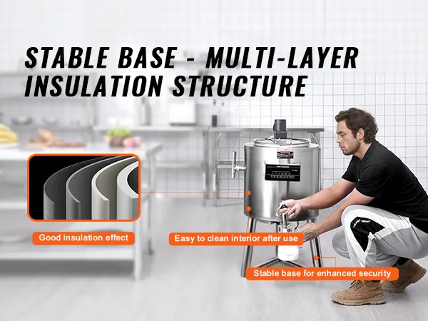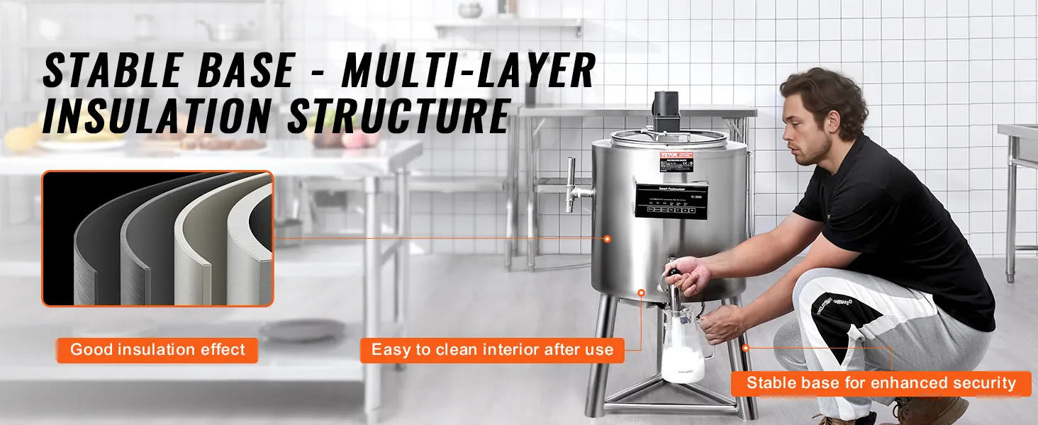 The pasteurizer is constructed with food-grade 304 stainless steel for the inner tank and a sturdy stainless steel outer shell, offering corrosion resistance, ensuring easy cleaning and a long lifespan.