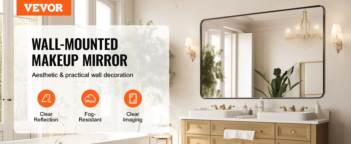 VEVOR vægmonteret makeupspejl, 0,15" tykt, 36" x 48" spejl med aluminiumsramme og eksplosionssikker film, ridsefast spejl med Z-formet beslag, egnet til badeværelse/soveværelse/stue