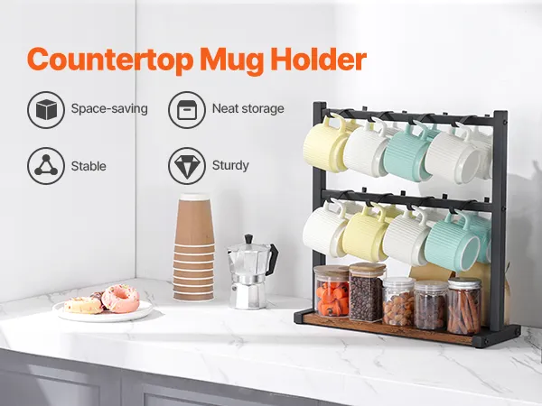 Odolný a stabilní: Stojan na hrnky je vyroben z kvalitní uhlíkové oceli, nabízí vysokou nosnost, je odolný vůči deformaci a je robustní a odolný. Kovový povrch je hladký, aby se zabránilo poškrábání.