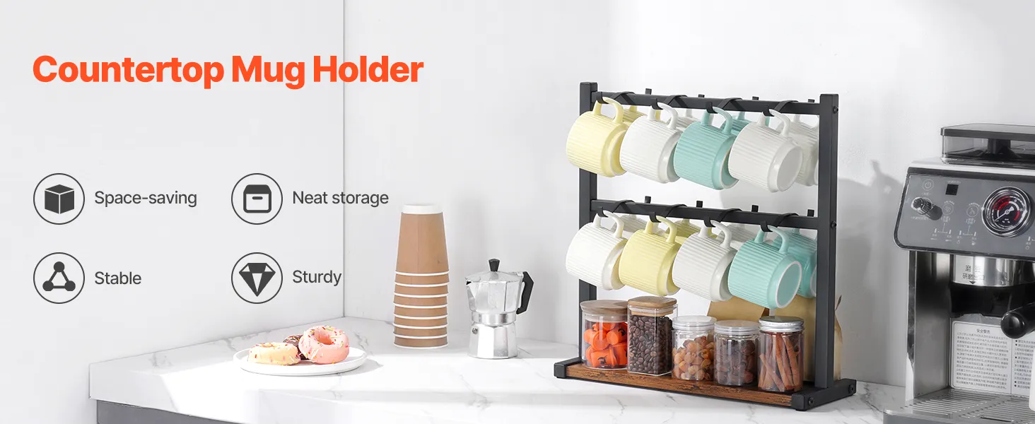 Držák na hrnky na kávu vám pomůže maximálně využít váš prostor a volně jej umístit v kanceláři, kuchyni nebo doma. Pomáhá s organizací a ukládáním hrnků na kávu, stejně jako příslušenství a dalších předmětů, a udržuje tak vaši kuchyňskou linku uklizenou a uspořádanou.