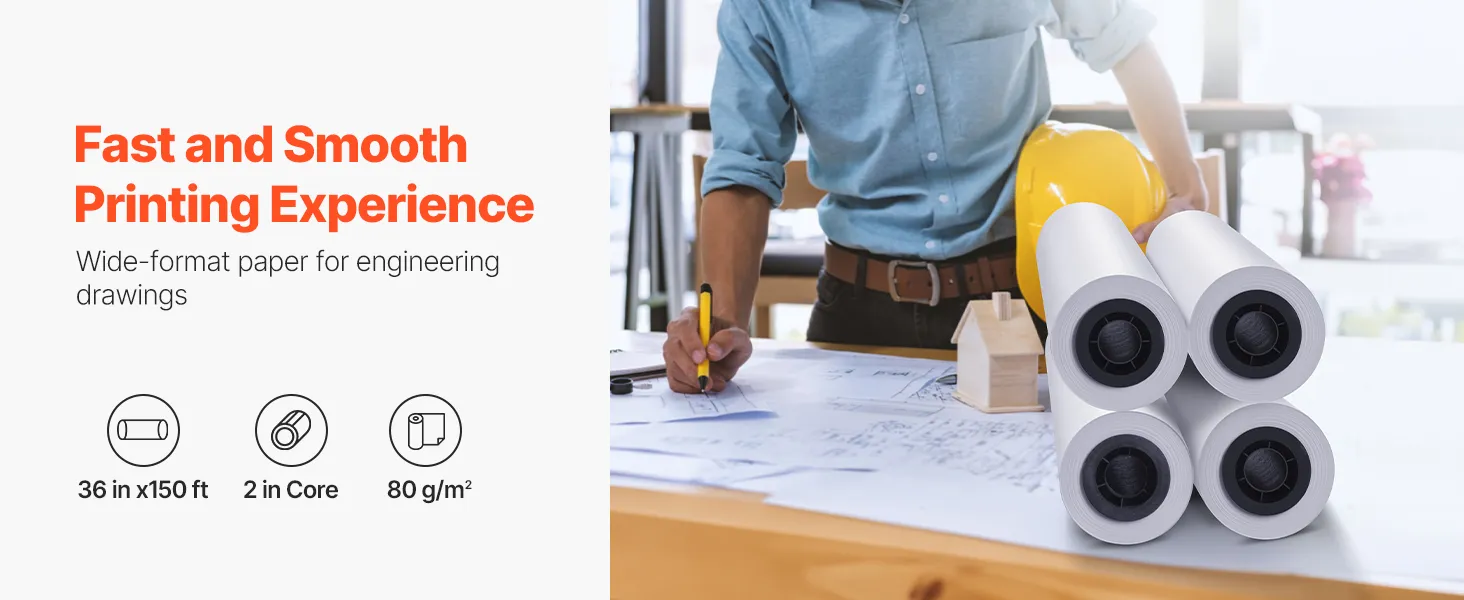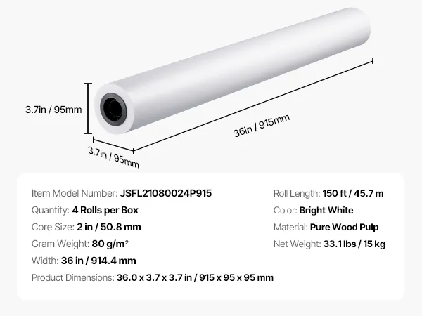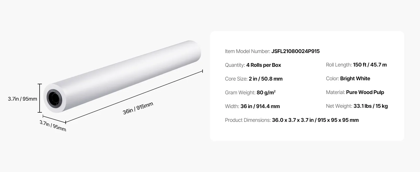 Standardní role: Tento širokoformátový papír se dodává v krabici se čtyřmi rolkami, každá o šířce 914,4 mm (36 palců) a celkové délce 45,7 m (150 stop). Poskytuje přesné a nepřetržité výsledky tisku, ideální pro velké technické výkresy a architektonické plány. Dvoupalcové jádro je vhodné pro většinu standardních plotrových tiskáren.