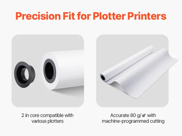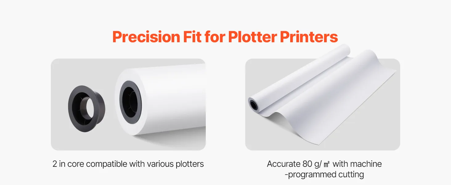Přesná kontrola hmotnosti: Náš papír do plotru využívá nové, strojově programované výpočty délky, které nabízejí větší přesnost než starší metody řezání. Gramáž 80 g/m² a přesná délka zajišťují kompatibilitu se specifikacemi velikosti tiskárny pro plynulé podávání papíru a menší zasekávání.