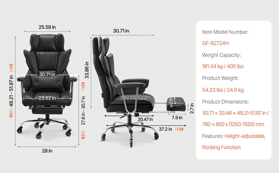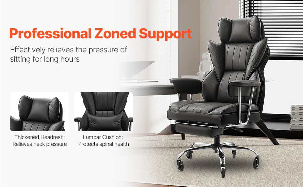 VEVOR Executive Office Chair, High Back Chair with Footrest and Removable Armrests, Ergonomic Desk Chair High-Resilience Foam Cushion, PU Leather Swivel Rolling Chair for Work, Study, Game, Black