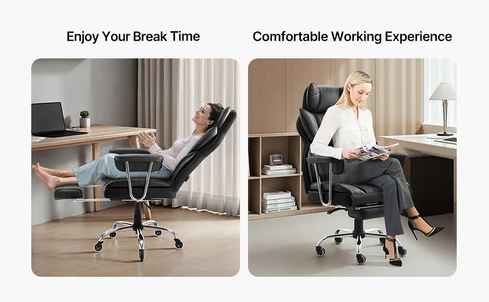 The heavy-duty 400 lbs / 181.44 kg reinforced metal base, combined with wear-resistant and silent wheels, ensures smooth 360° movement. This solid construction keeps your executive office chair stable, so you can focus on work without worrying about wobbling.