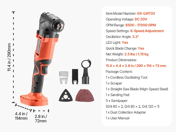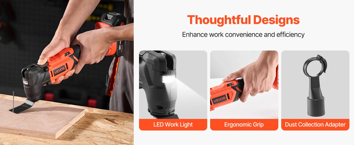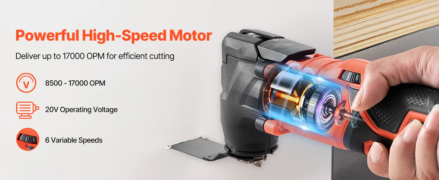 VEVOR 20V cordless oscillating tool comes with a variety of saw accessories to handle sanding, cutting, scraping and more tasks easily. It features 6 speeds from 8,500 to 17,000 OPM, a quick blade change design, LED work light - ideal for home improvement, woodworking, and DIY projects.