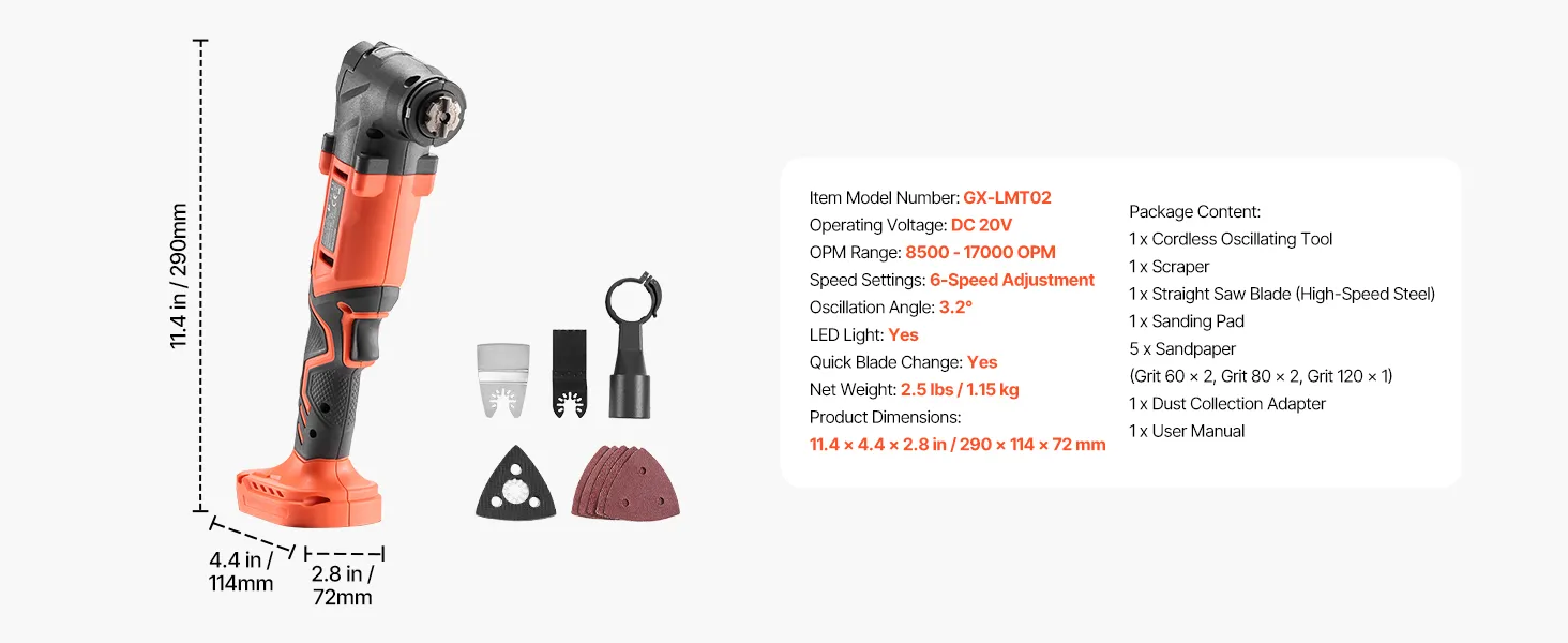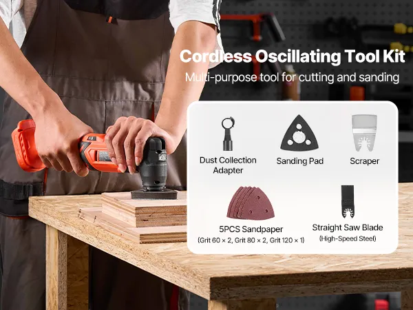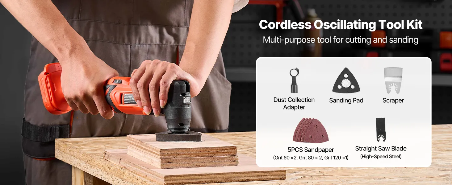 Multi-functional Tool Kit: VEVOR 20V cordless oscillating tool kit includes a stainless steel scraper, high-speed steel straight saw blade, sanding pad, and 5 sandpapers (60/80 Grit *2, 120 Grit * 1)). Ideal for home improvement, woodworking, and DIY projects