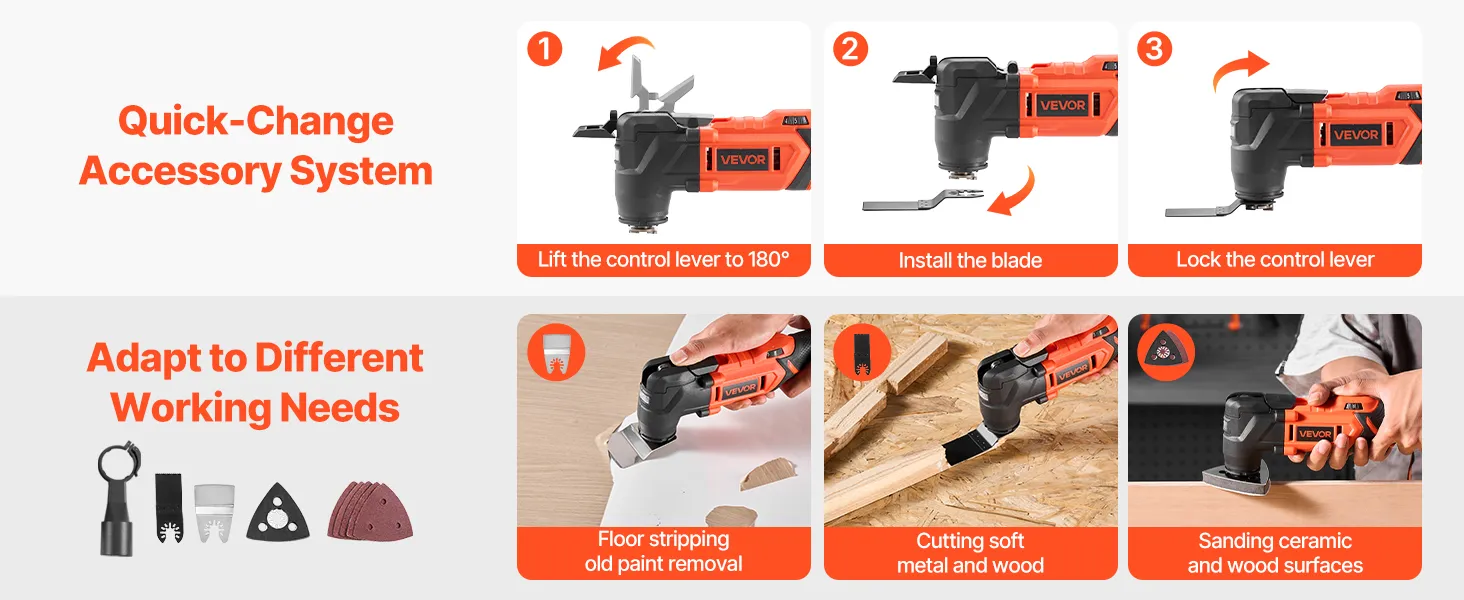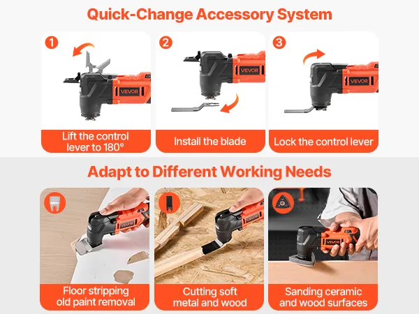 Quick Blade Change: Our oscillating multi tool has a locking lever, easy to change attachments without needing a wrench. Step 1: Lift the control lever to 180°degrees. Step 2: Install the blade. Step 3: Lock the control lever into place