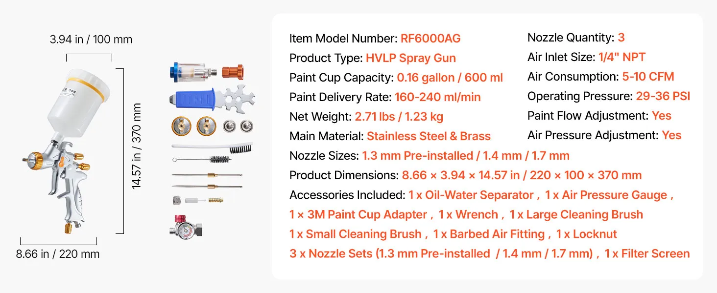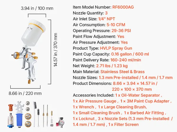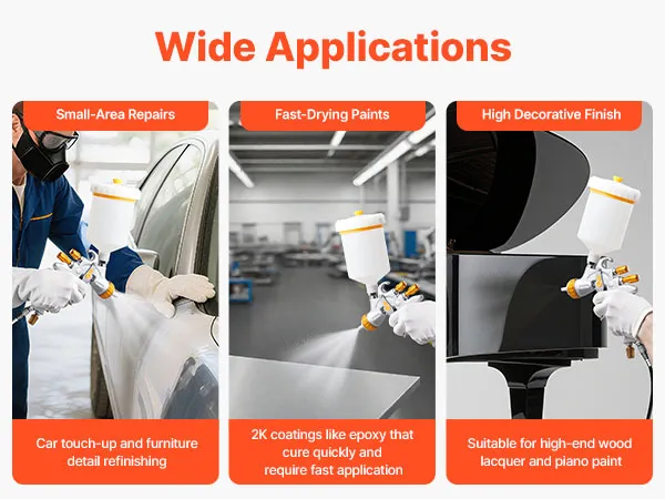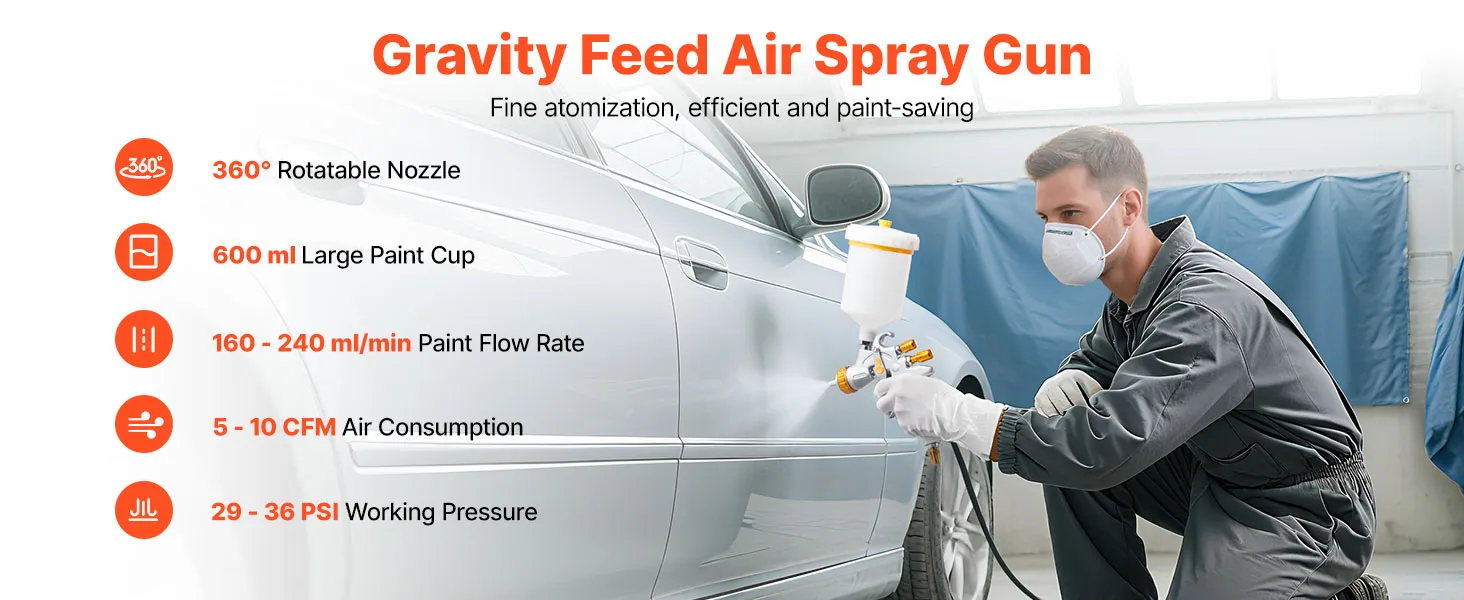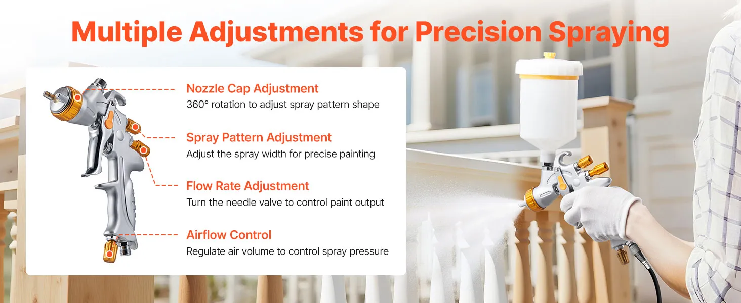 Are you tired of experiencing paint leakages and uneven spraying? Say goodbye to those problems with the help of VEVOR HVLP air spray gun! Our gravity feed paint sprayer features 3 nozzles, adjustable paint flow, fine atomization, uniform spray, and paint-saving efficiency.