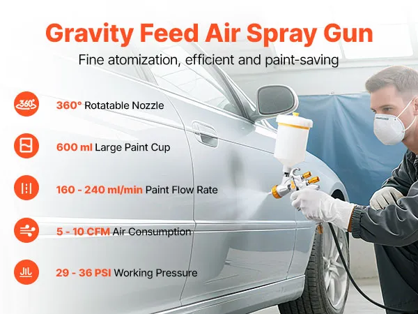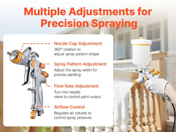 Flexible Adjustments: Featuring a 360° rotating nozzle cap and three independent knobs for spray pattern, paint flow, and air volume adjustment, this gravity feed paint spray gun provides precise control to suit different spraying needs