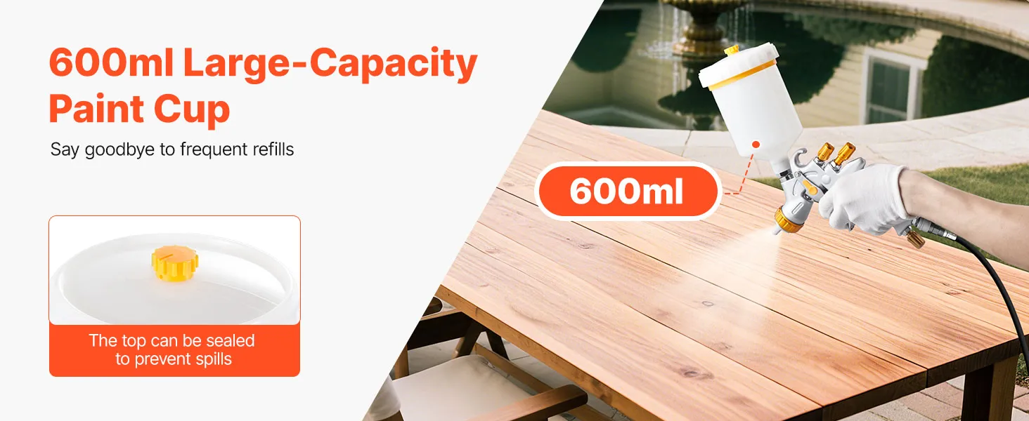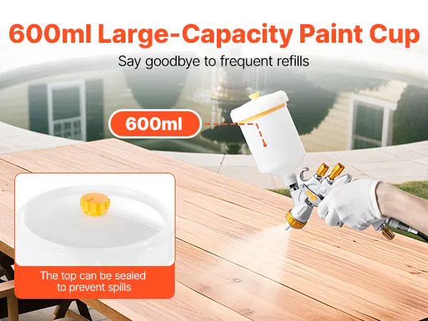 600 mL (20 oz) large-capacity paint cup reduces the need for frequent refills and allows longer, uninterrupted spraying for smoother, steadier, more efficient results.