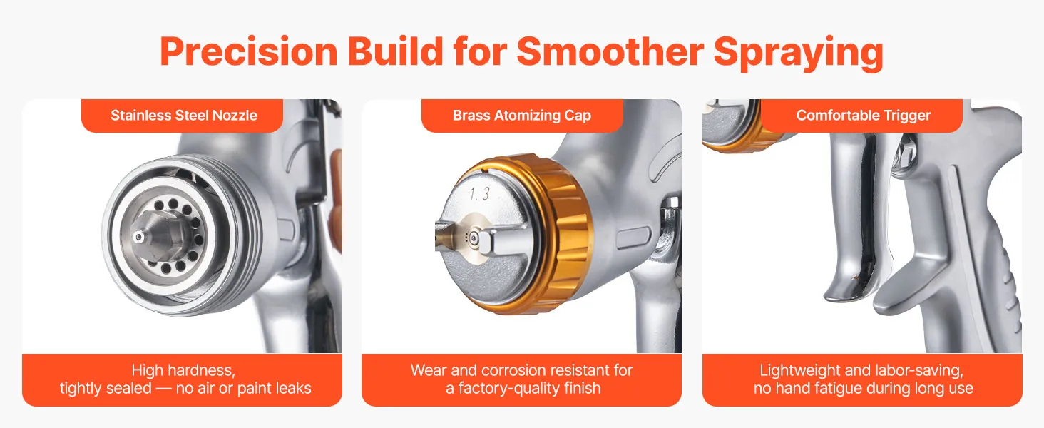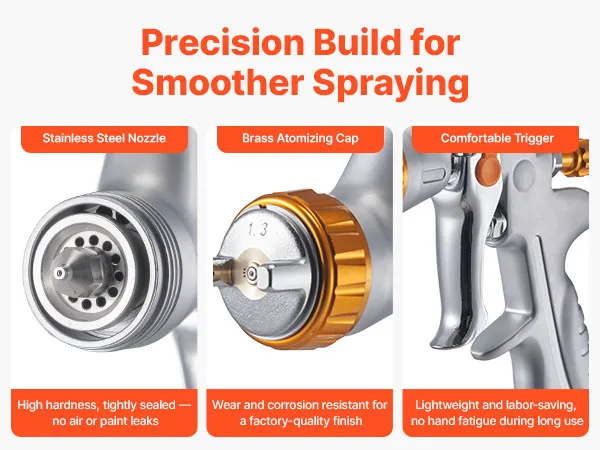 The durable stainless steel nozzles and brass atomizing cap help prevent air and paint leaks, Responsive trigger and ergonomic grip reduce hand fatigue and ensure more precise spray control.