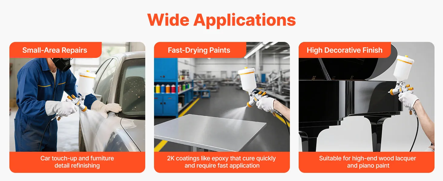 Finer Atomization: HVLP air spray gun provides ultra-fine, smooth atomization and is particularly suited for topcoats that require high gloss and smooth leveling (such as automotive clear coats, high-end furniture coatings, and precision industrial spraying)
