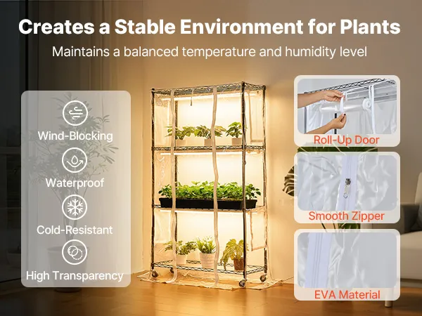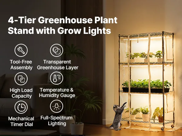 Greenhouse Environment: This 4-tier plant stand includes a clear cover, hygrometer, and LED grow lights to maintain warmth and resist cold. Offers ideal lighting and humidity for flowers, seedlings, microgreens, and vegetables. The clear cover and meter make it easy to monitor plant health and temperature/humidity at a glance.