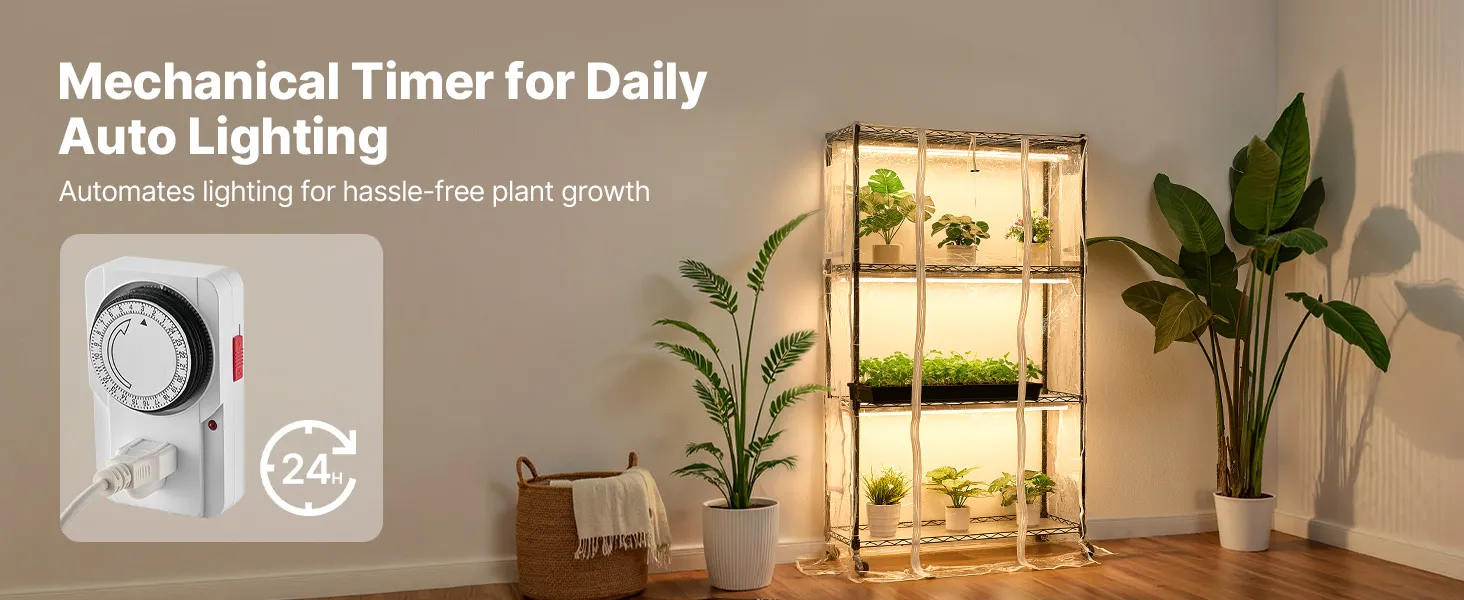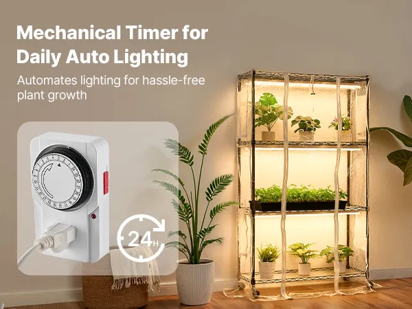 Mechanical Timer: The indoor plant stand with grow light features built-in 24-hour programmable timer with 15-minute intervals for easy operation. Set once for daily automatic on/off, ensuring plants receive consistent, energy-efficient lighting cycles.