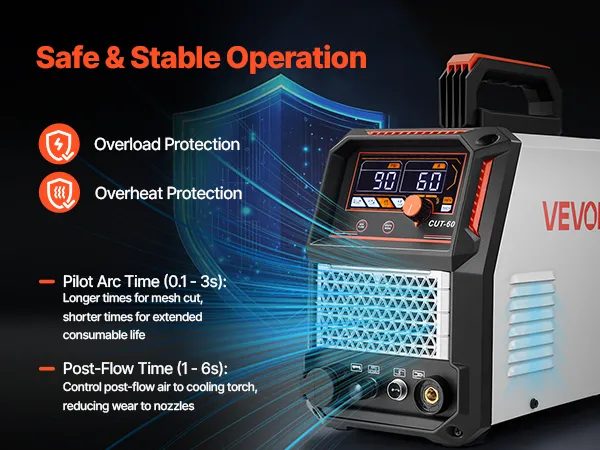Digital Display: The 3-phase plasma cutting machine features a large digital display with a clear and intuitive interface, allowing for quick adjustments and real-time monitoring. Built in overheat and overload protection for safer operation and longer lifespan