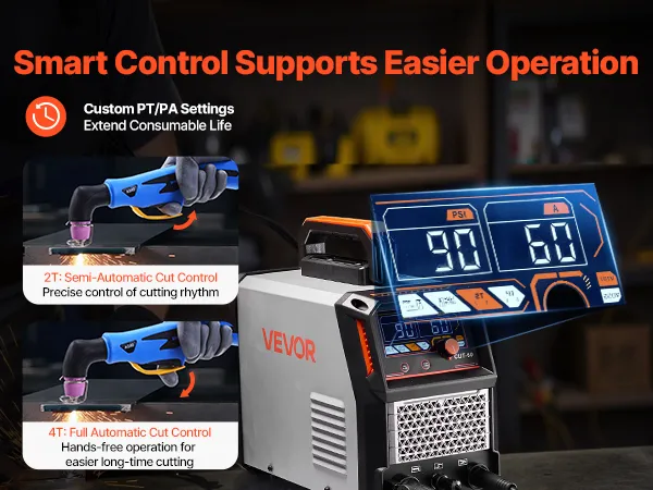 Intelligent Control: Featuring adjustable PT time (1-6s) and PA time (0.1-3s) to extend the life of consumables. Also comes with 2T/4T functions: 2T provides semi-automatic cutting for short, precise tasks, 4T allows automatic cutting for long-term continuous operation