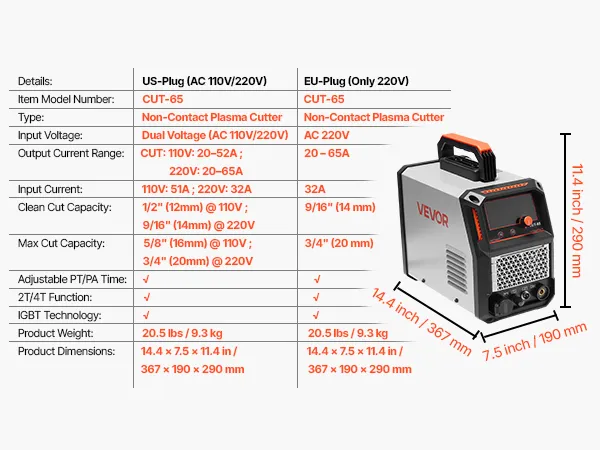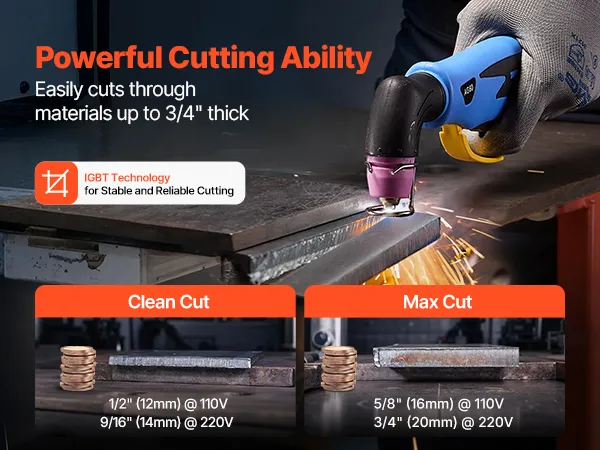 Powerful Cutting: This VEVOR plasma cutter delivers a maximum output current of 65A for powerful cutting. It supports clean cuts up to 14mm, with a maximum cutting thickness of 20mm. (Note: 220V only. Power adapter not included)
