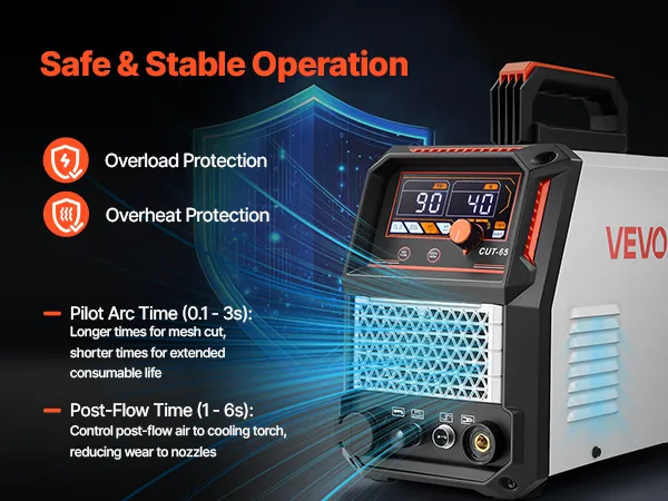 Digital Display: The plasma cutting machine features a large digital display with a clear and intuitive interface, allowing for quick adjustments and real-time monitoring. Built in overheat and overload protection for safer operation and longer lifespan