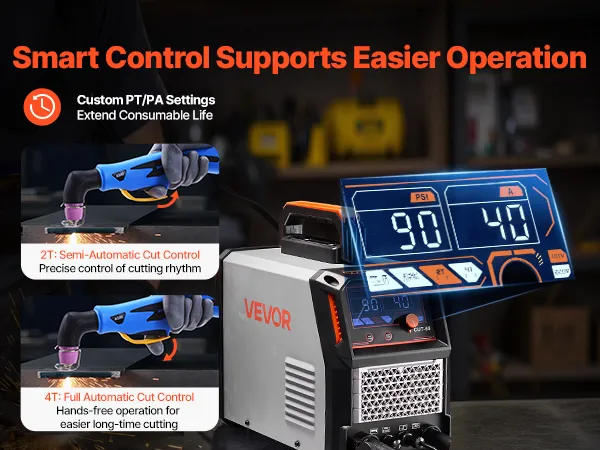 Intelligent Control: Featuring adjustable PT time (1-6s) and PA time (0.1-3s) to extend the life of consumables. Also comes with 2T/4T functions: 2T provides semi-automatic cutting for short, precise tasks, 4T allows automatic cutting for long-term continuous operation