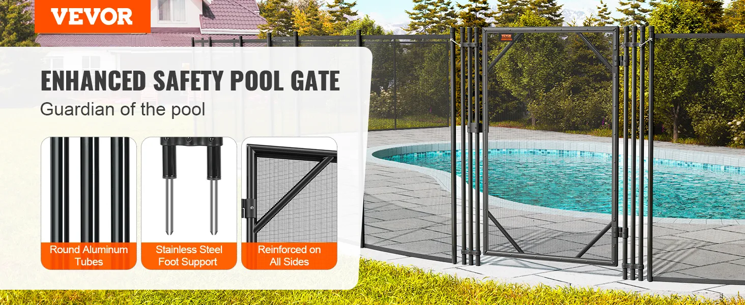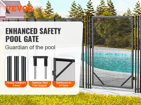 Pevný rám bazénovej brány: Vynikajúco vyrobená bazénová brána má 2,5 cm hrubé štvorcové hliníkové tyče a 9,3 cm dlhé nohy z nehrdzavejúcej ocele, ktoré poskytujú vynikajúcu odolnosť voči korózii a trvanlivosť pre dlhodobú stabilitu a bezpečnosť.