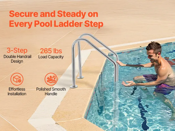 Vores 3-trins poolstige i rustfrit stål med dobbelte gelændere tilbyder stabil og sikker ind- og udstigning. Den understøtter op til 115 kg og passer til brugere i alle størrelser. Installationen er enkel, og de glatte gelændere sikrer et fast greb. Med vedvarende stabilitet er stigen ideel til både indendørs og udendørs pools.