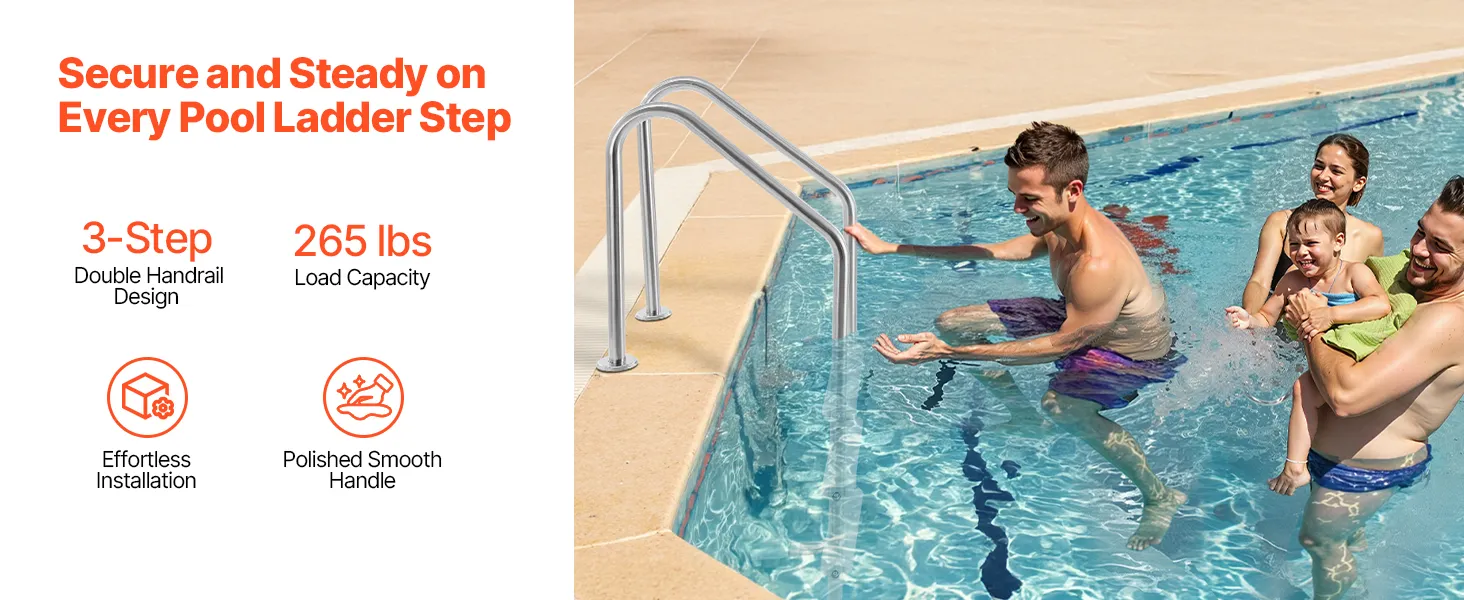 VEVOR swimmingpoolstige, 3-trins dobbelte gelændertrapper med skridsikre, kraftige trin, rustfrit stål, lasteevne 114 kg, til 122-142 cm nedgravede pools på enhver terrasseoverflade, indendørs og udendørs
