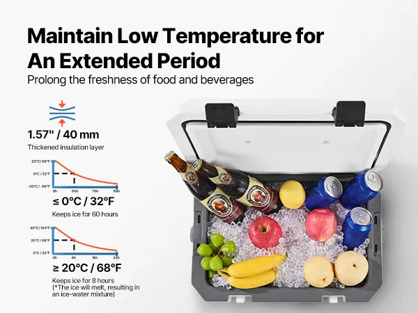 Dlouhotrvající chlazení: Díky izolační vrstvě o tloušťce 40 mm udržuje led až 60 hodin při teplotách ≤ 0 °C a až 8 hodin při teplotách ≥ 20 °C (led se roztaví a přemění se na ledovou vodu). Tip: Pro dosažení optimálních výsledků se vyhněte přímému slunečnímu záření a použijte alespoň 40 % ledu v poměru k celkovému objemu.