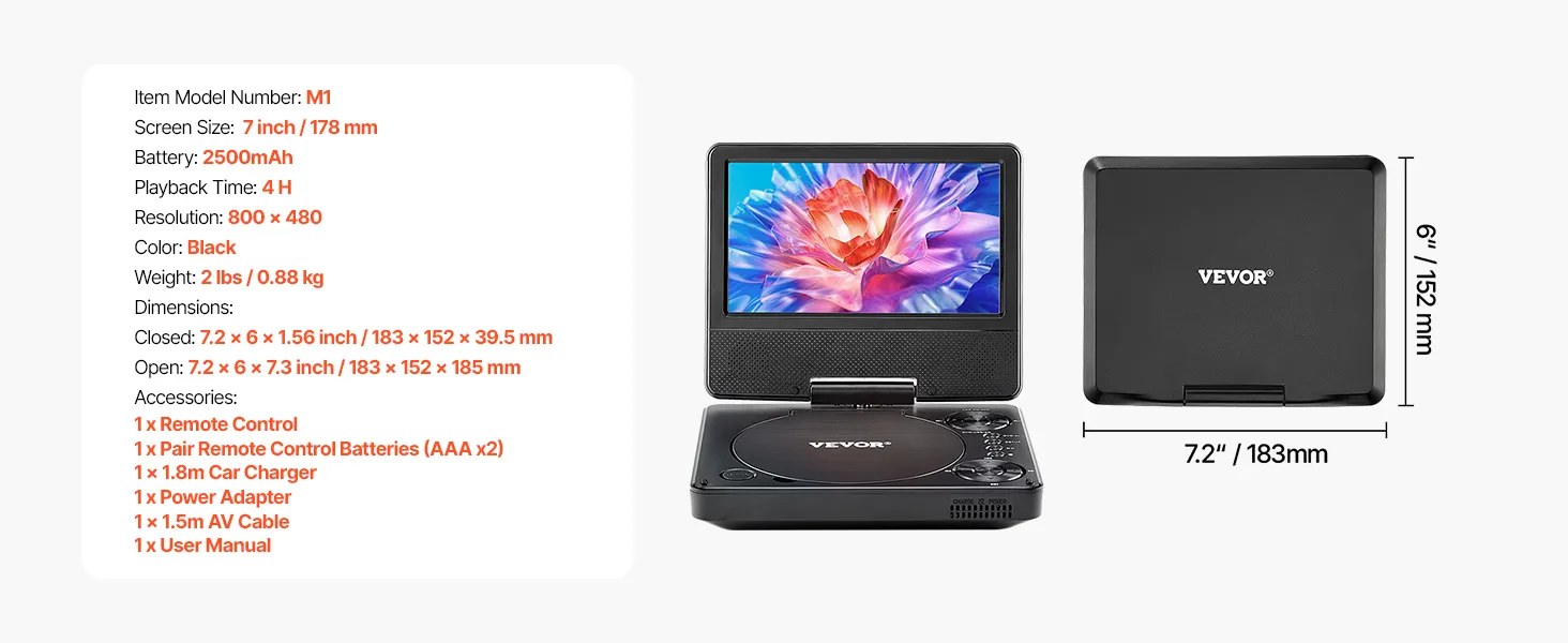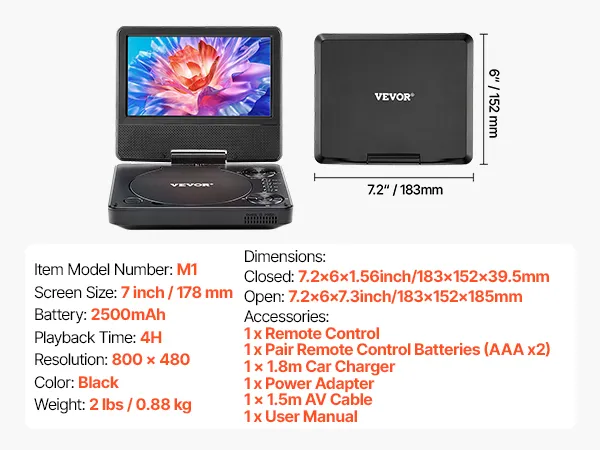 Long-lasting Battery Life: Equipped with a built-in 2500mAh rechargeable battery, this portable DVD player with screen provides up to 4 hours of playback, fulfilling your needs. It also comes with an AC adapter and car charger for on-the-go power