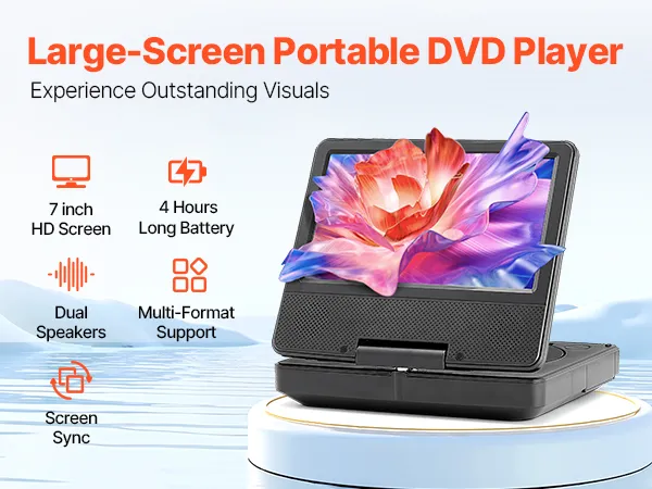 With a 7-inch HD screen (800 x 480 resolution) and 4 hours of battery life, this portable DVD player allows you to enjoy crisp visuals and long viewing. Dual speakers ensure immersive sound, and multiple format support meets your media needs. Screen sync feature makes sharing content easy.