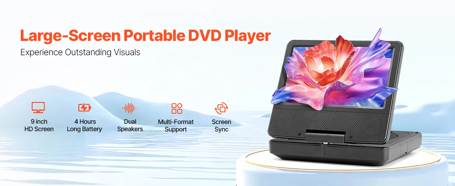 VEVOR Portable DVD Player, 7 inch HD Swivel Display Screen, 4 Hours Built-in Rechargeable Battery, Dual Speakers, Support Sync TV/USB/SD Card/CD/DVD, Car Charger, AC Power Adapter, Remote Control