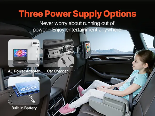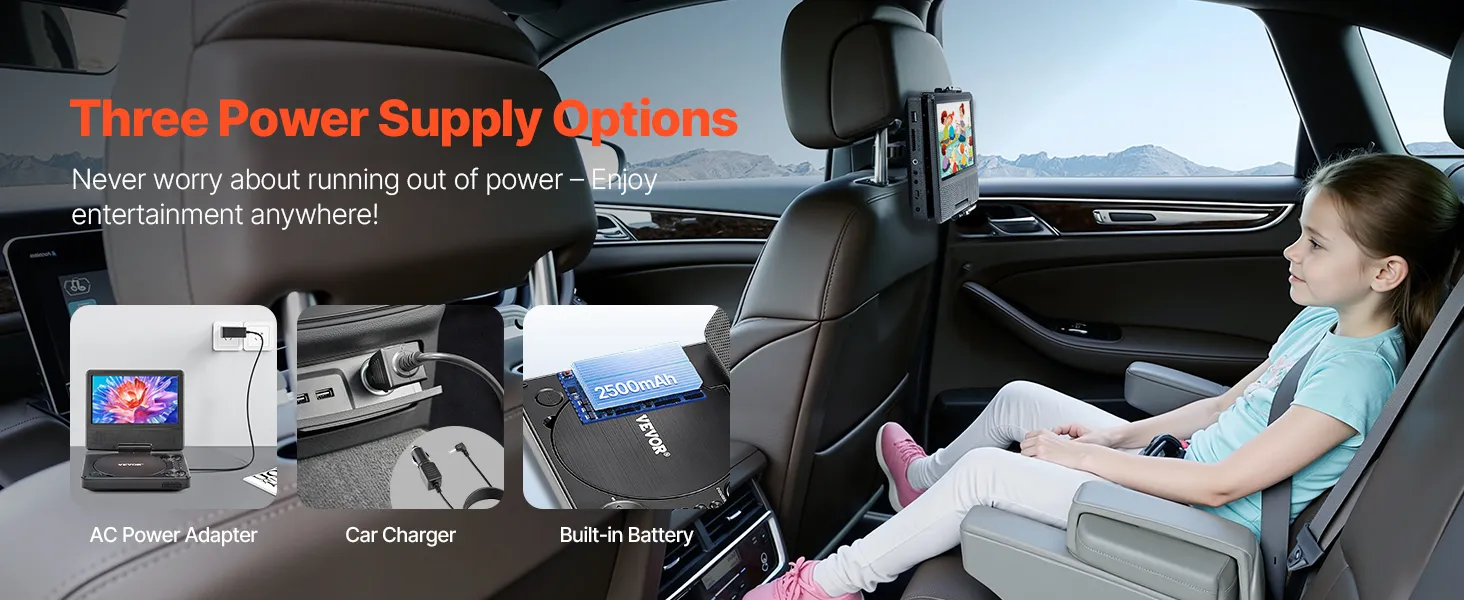 The portable DVD player with screen has a built-in battery. Enjoy extended use without worrying about running out of power. The AC power adapter is ideal for home use, and the car charger makes travel convenient. Whether for road trips or everyday use, it is ready to entertain in any setting.