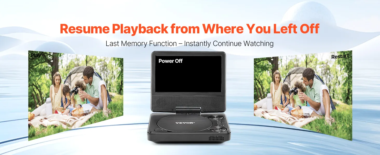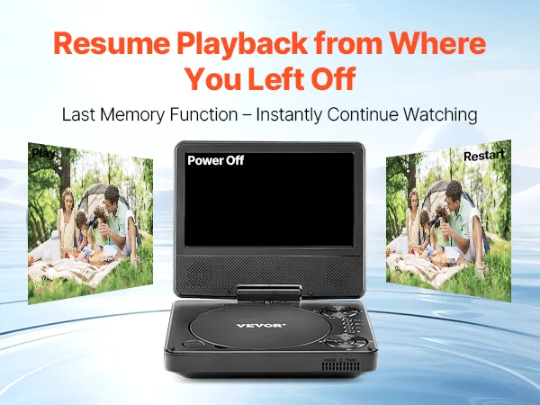 This DVD player with screen features a last memory function, automatically remembering the last viewing position, whether paused, powered off, or restarted. No need to search for your spot again—simply resume watching and enjoy a seamless viewing experience.