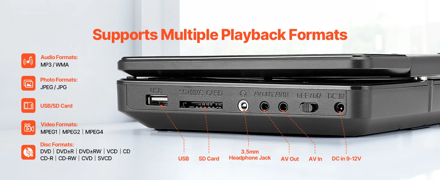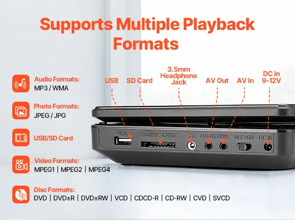 Supports Multiple Formats: The travel DVD player can play all region discs including DVD, DVD±R, DVD±RW, VCD, CD, CD-R, CD-RW, CVD, and SVCD. It also supports USB and SD cards (up to 32GB) and formats like MPEG1, MPEG2, MPEG4, MP3, WMA, JPEG, JPG