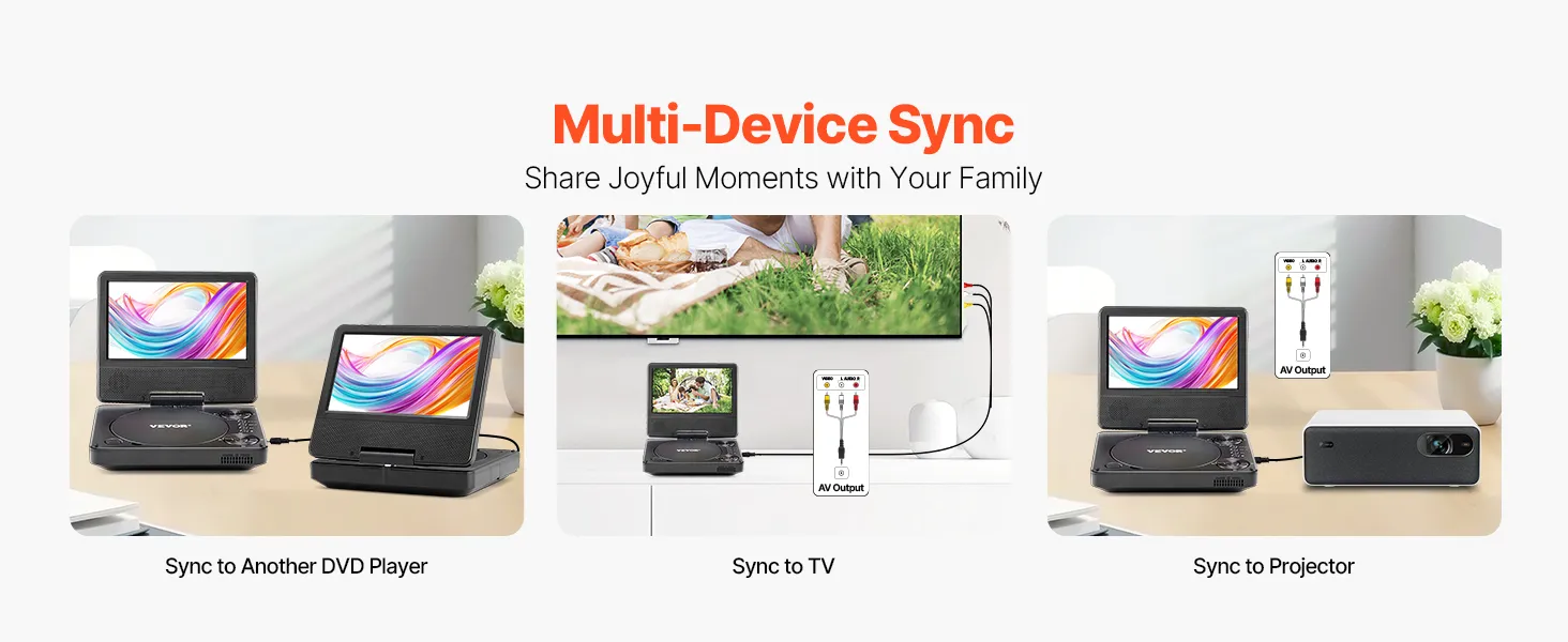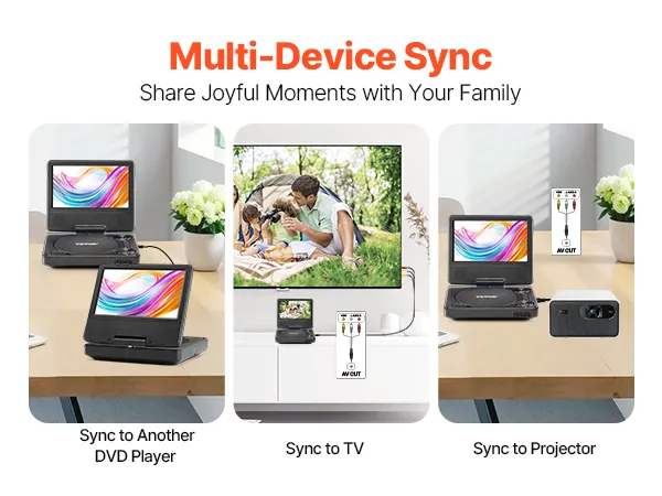 With AV output, easily sync your device's screen to another DVD player of the same model, a TV, or a projector for shared viewing. Enjoy more fun with family and friends through multi-screen entertainment.