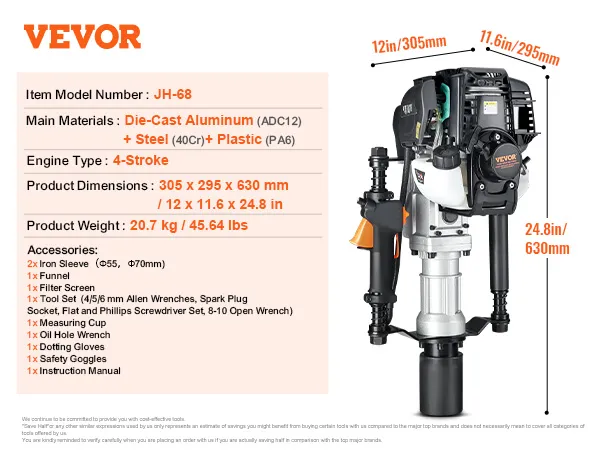 4-Stroke Engine: The engine and body are made from durable aluminum alloy. With a powerful 1000W output, it ensures fast, stable, and precise piling. Rated speed: 6500 RPM. The engine operates smoothly, doesn’t overheat, and utilizes fuel efficiently. Maximum torque: 1.6 N·m.