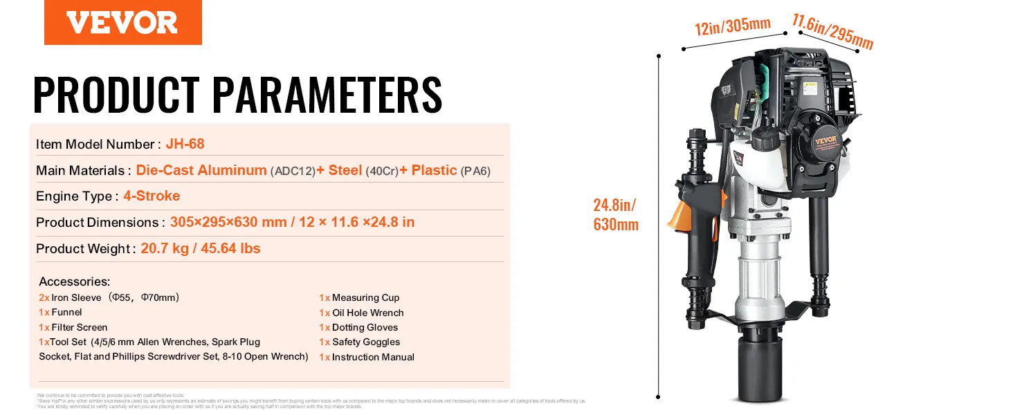 User-Friendly Design: The pile driver features a non-slip handle for comfort, an easy start device for quick ignition with minimal pulling force, a shock-absorbing spring to reduce engine vibration. Oil supply hose: Before use, ensure that the oil supply hose is fully filled with oil.