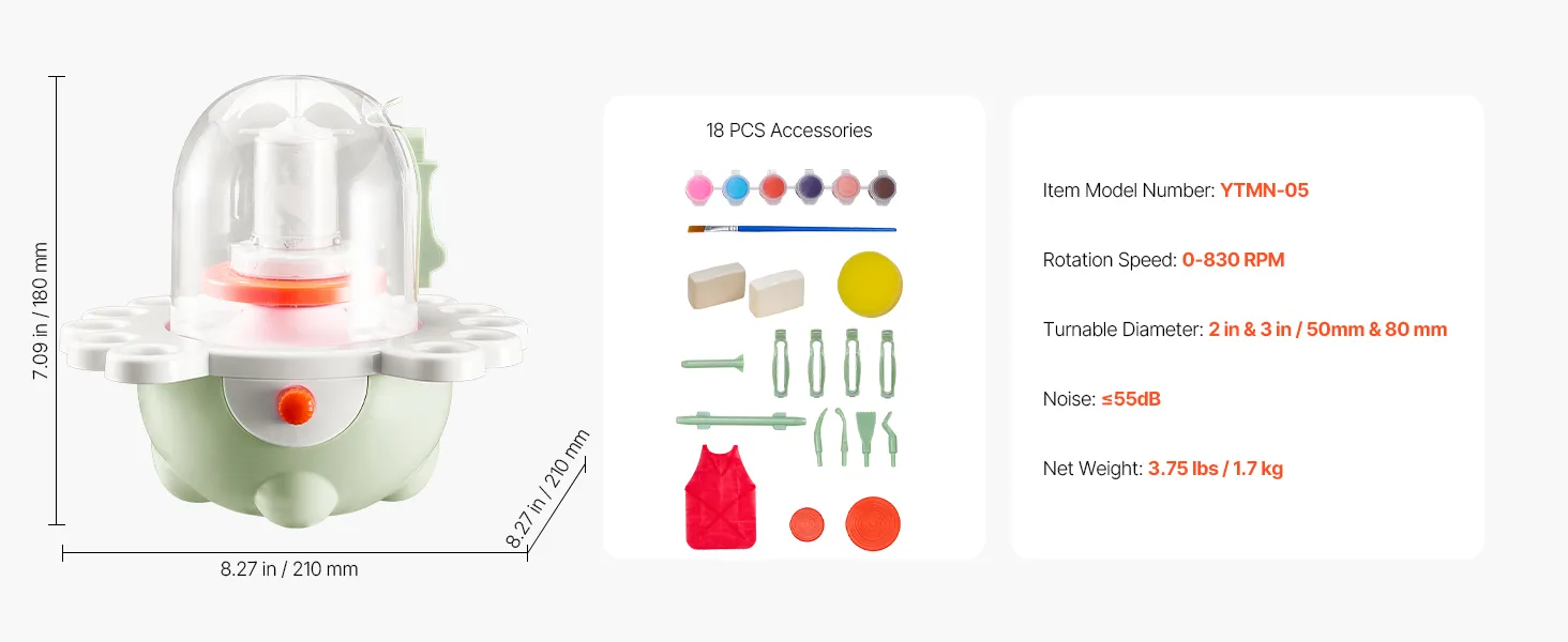 Simple Operation: Designed for beginners, this small pottery wheel features easy knob control with adjustable speeds from 0–830 RPM. USB powered for convenience, it's ideal for first-time users or growing artists who want to explore clay crafting