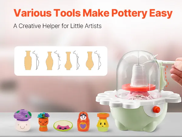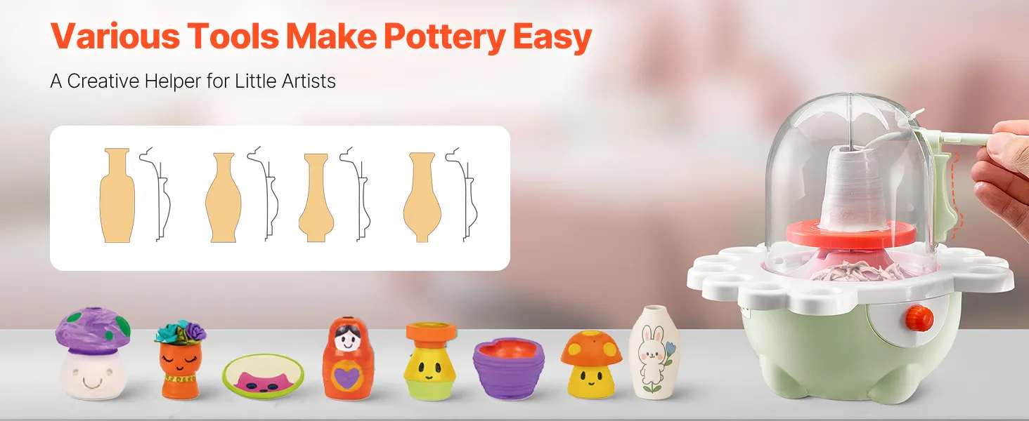 Our small pottery wheel includes multiple tools to help kids shape pottery with ease. These tools provide stable support and clear guidance, making it easier for children to learn techniques, form ideal shapes, and build confidence through successful creation.