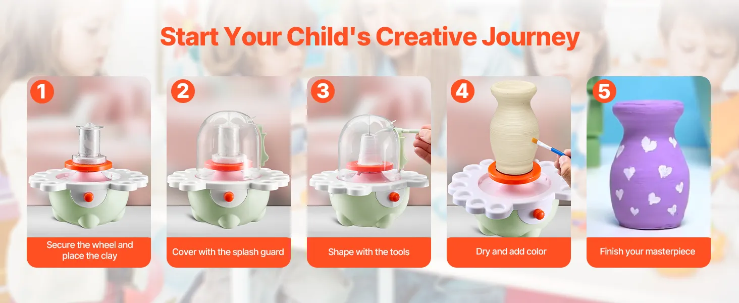 Designed with young creators in mind, this pottery wheel for kids is simple and intuitive to use. From basic shaping to detailed finishing, each step is easy to follow and lets kids enjoy pottery while building artistic interest.