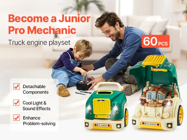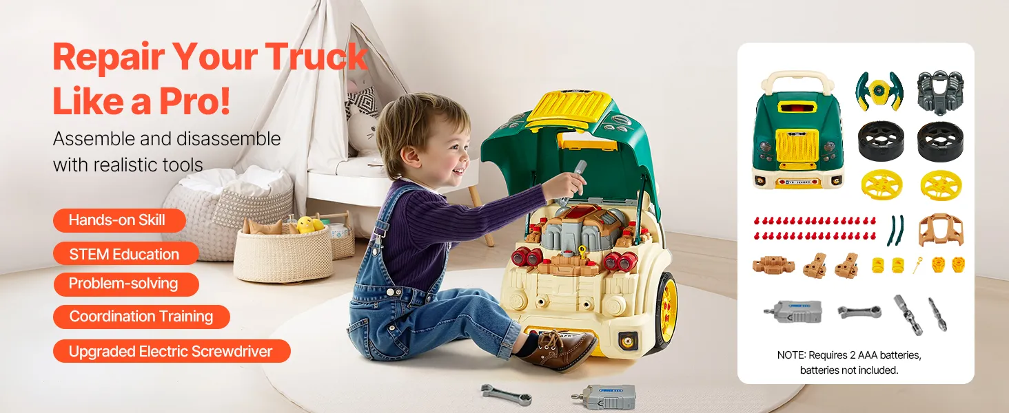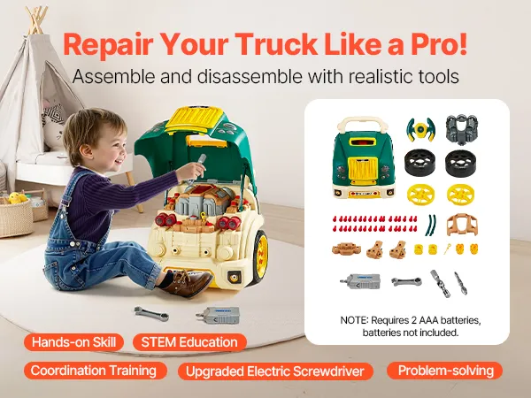 Time to get hands-on! Every engine part of our truck mechanic toy is detachable and reassembleable. With a cool electric screwdriver (batteries not included) and plenty of tools, kids will feel like real mechanics while learning about how car engines work.
