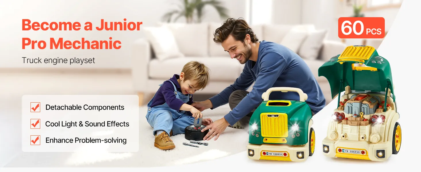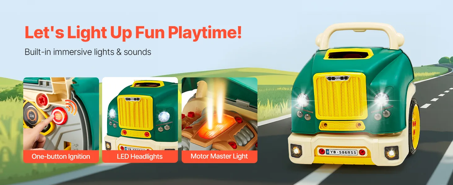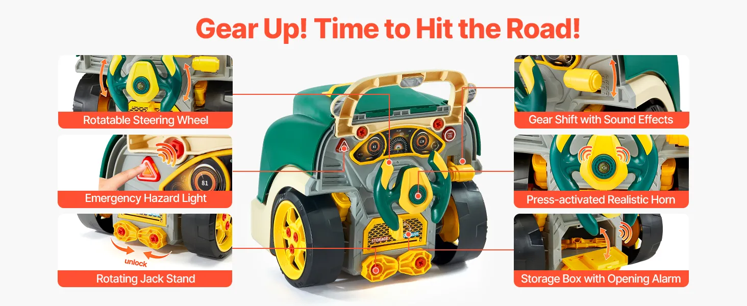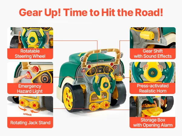 Drive Like a Pro: Start the engine, shift gears, and honk the horn! The interactive cockpit of our engine toy has lights and sounds to make every move feel real. Plus, the tool storage box with alarm sounds teaches kids organization while having fun!