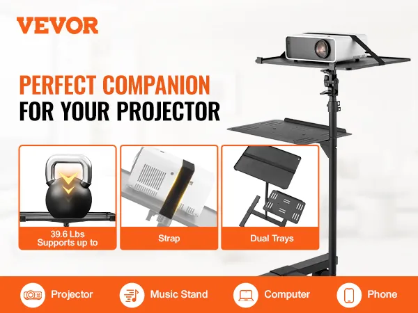 Stojan na projektor VEVOR s kolečky, Nastavitelná výška stojanu na projektor od 22,8 do 57,3 palce, Držák projektoru se 2 přihrádkami, Ideální pro venkovní filmy, doma, v kanceláři, na jeviště a do studia, Černý