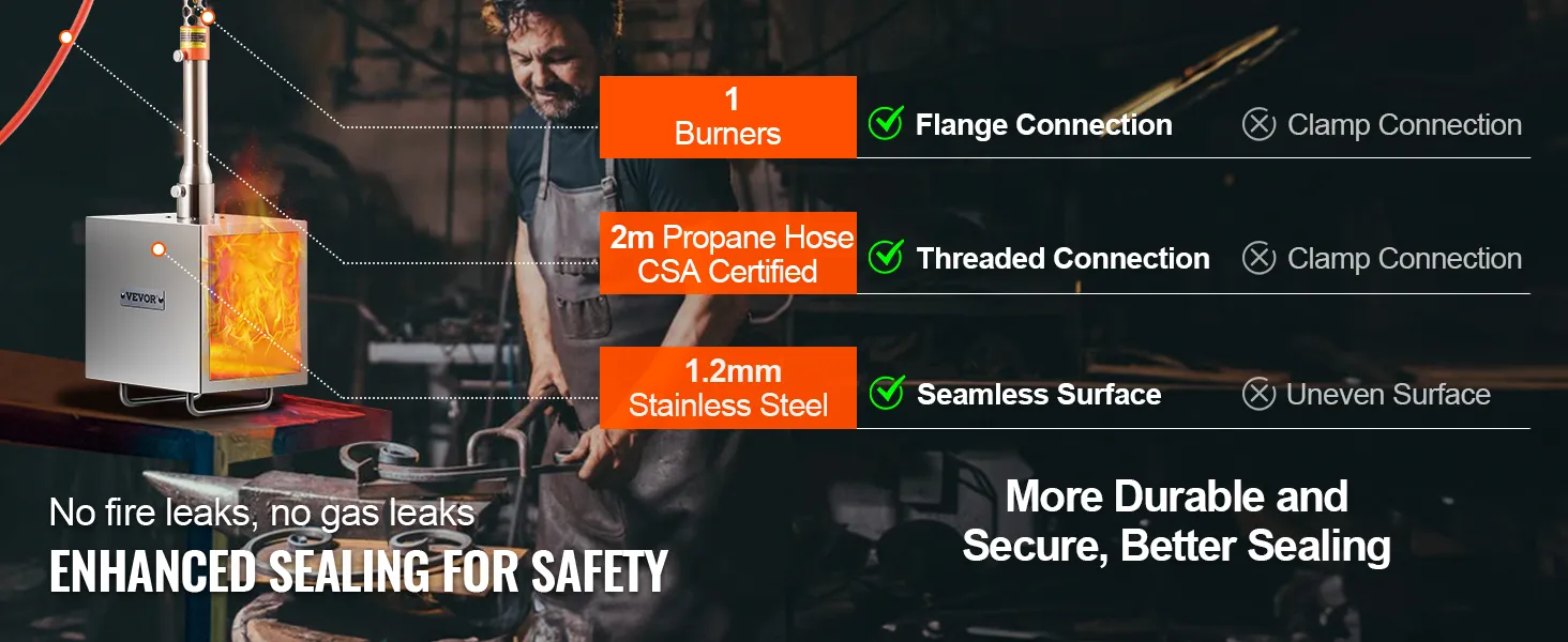 Upgraded Craftsmanship & Safety: The propane forge body is made of 1.2mm corrosion-resistant 201 stainless steel with a seamless exterior. Upgraded burners with flanges and rivets ensure durability and avoid the risk of fire leaks. For enhanced safety, the CSA-certified propane hose has been upgraded from traditional clamps to threaded connections, ensuring no gas leaks.