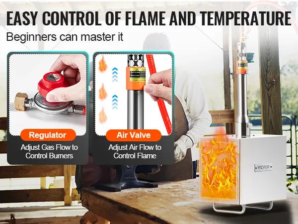 Simple Operation & Temperature Control: The gas forges for blacksmithing feature 1 burner. The air valve adjusts the air-to-propane ratio, and the regulator controls propane flow. These settings allow precise firepower and temperature control for various metals, including gold, copper, silver, stainless steel, steel, brass, bronze, magnesium, aluminum, alloys, lead, and tin.