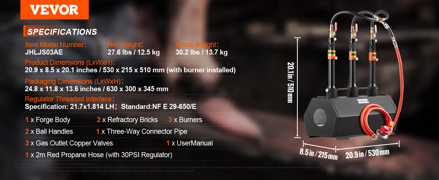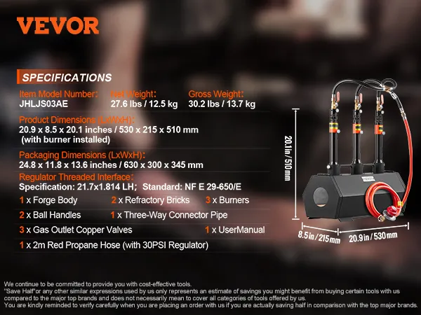 Přenosná propanová kovárna VEVOR, kovárna se 3 hořáky, kovárna s plynovou pecí 2600℉ pro výrobu nástrojů a nožů, velkokapacitní šestihranná ocel válcovaná za studena, nástroje a zařízení pro kování kovů