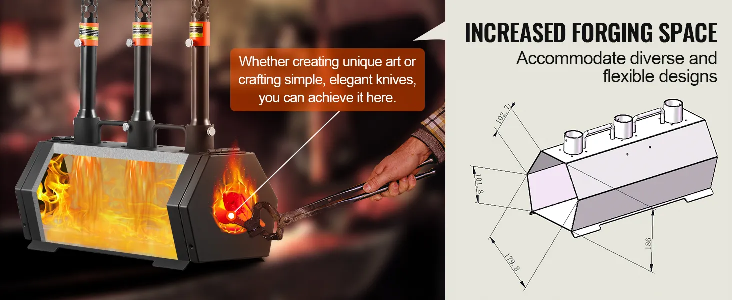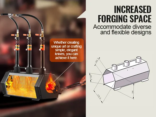 Větší prostor a flexibilní plnění: Kovářská výheň má šestiúhelníkový design, který vytváří vyšší a prostornější interiér, do kterého se vejdou kovové součásti různých velikostí a tvarů. Tato konstrukce podporuje rozmanité kovací potřeby, ať už se jedná o nože, hroty, náramky, šrouby nebo nůžky. Vědecky navržený vnitřní prostor navíc zlepšuje účinnost ohřevu.