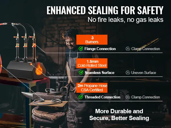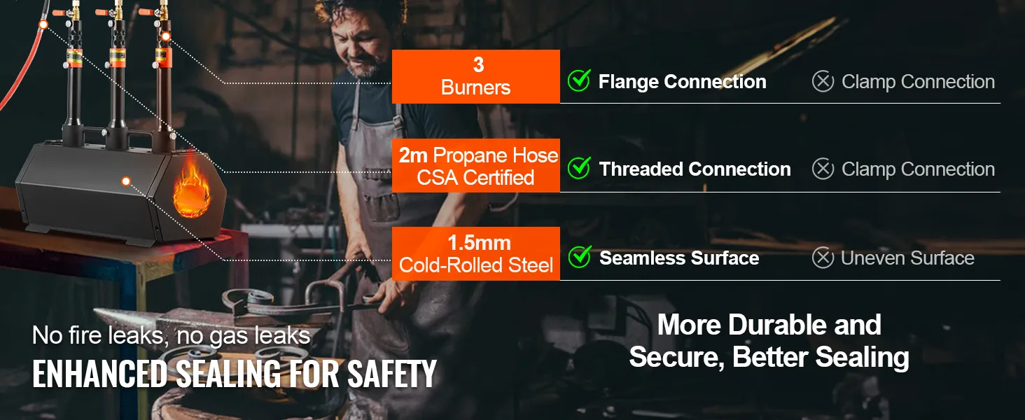 Vylepšené řemeslné zpracování a bezpečnost: Tělo propanové pece je vyrobeno z 1,5mm černě práškově lakované oceli válcované za studena s bezešvým vnějším povrchem. Vylepšené hořáky s přírubami a nýty zajišťují odolnost a zabraňují riziku úniku plynu. Pro zvýšení bezpečnosti byla propanová hadice s certifikací CSA vylepšena z tradičních svorek na závitové spoje, což zajišťuje, že nedochází k úniku plynu.