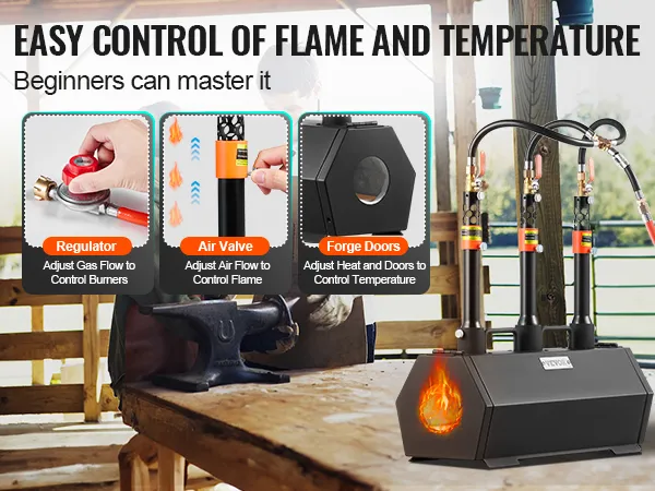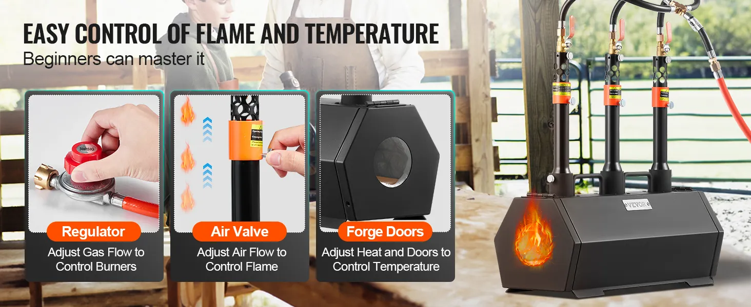 Jednoduchá obsluha a regulace teploty: Plynové kovářské pece jsou vybaveny 3 hořáky s nastavitelnými ventily pro ovládání použití 1, 2 nebo všech 3 hořáků. Vzduchový ventil upravuje poměr vzduchu a propanu a regulátor řídí průtok propanu. Tato nastavení umožňují přesnou regulaci palivového výkonu a teploty pro různé kovy, včetně zlata, mědi, stříbra, nerezové oceli, oceli, mosazi, bronzu, hořčíku, hliníku, slitin, olova a cínu.