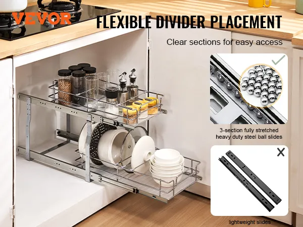 Pridané deliace priečky: Priečky môžete flexibilne nastaviť podľa svojich potrieb skladovania, čím zabezpečíte, že každá položka bude mať svoje vlastné určené miesto. Táto výsuvná polica s drôteným košom nielenže zvyšuje efektivitu skladovania, ale tiež chráni vaše predmety pred poškodením a udržiava váš priestor organizovaný.